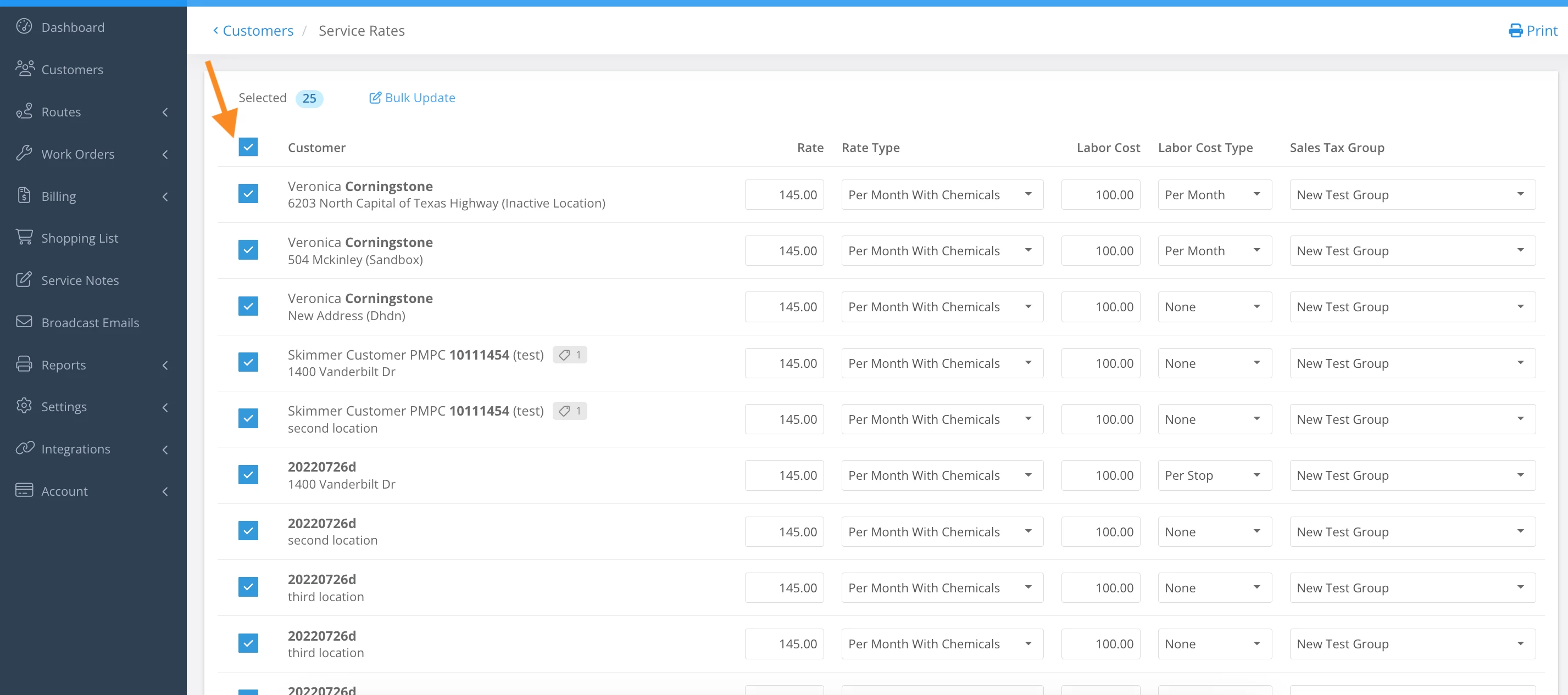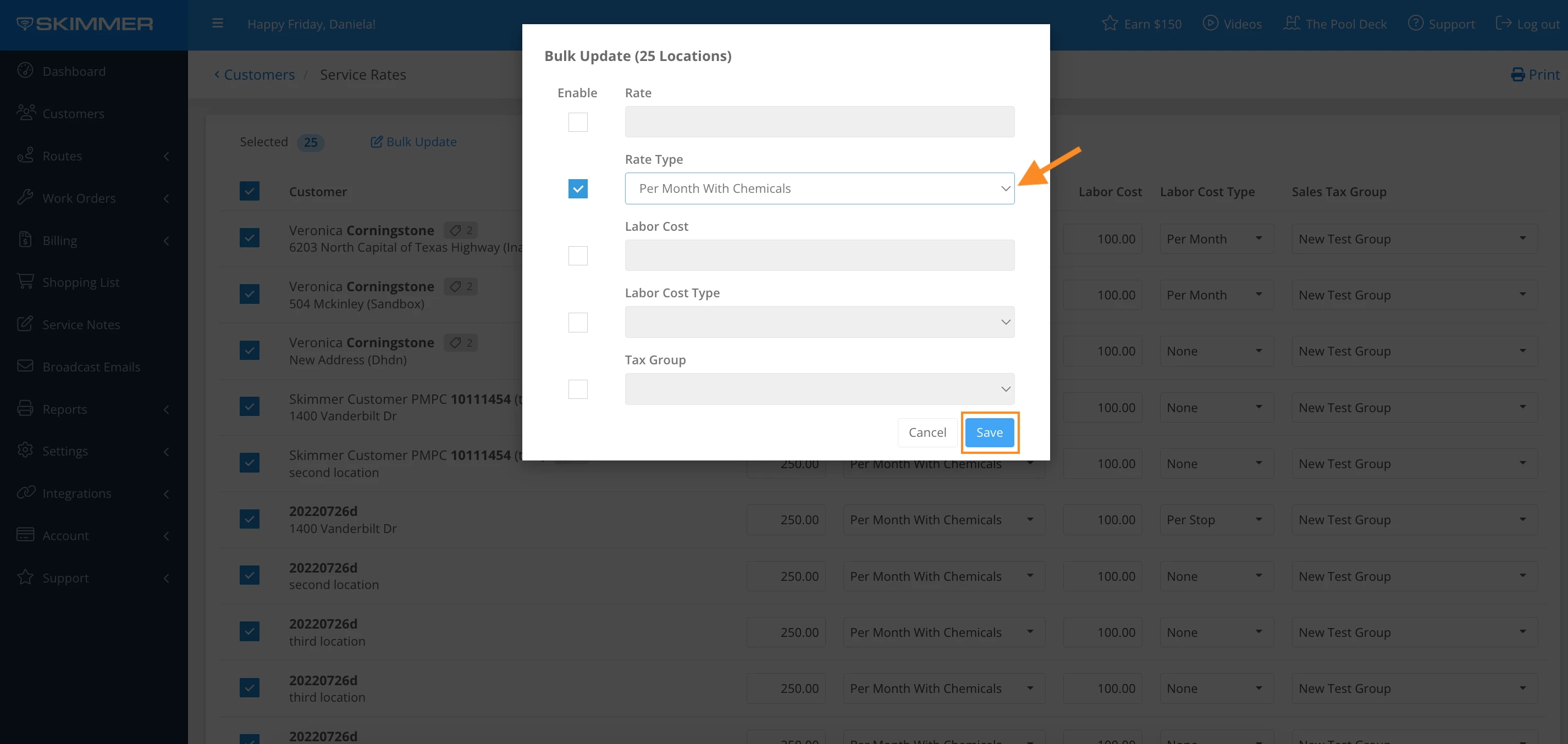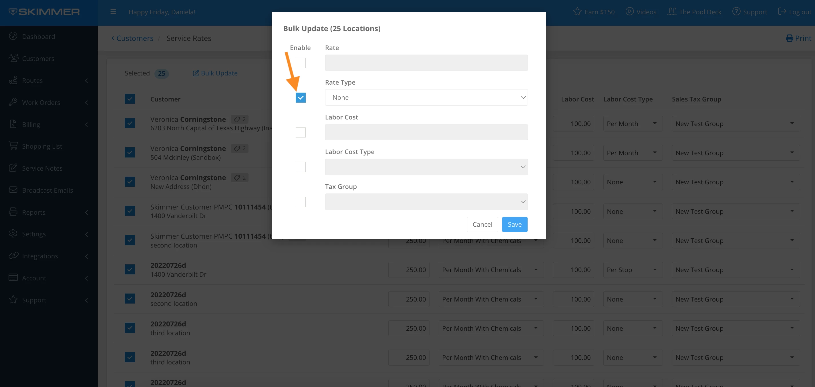 4. Select checkbox under Enable for the service rate that you would like to bulk update.