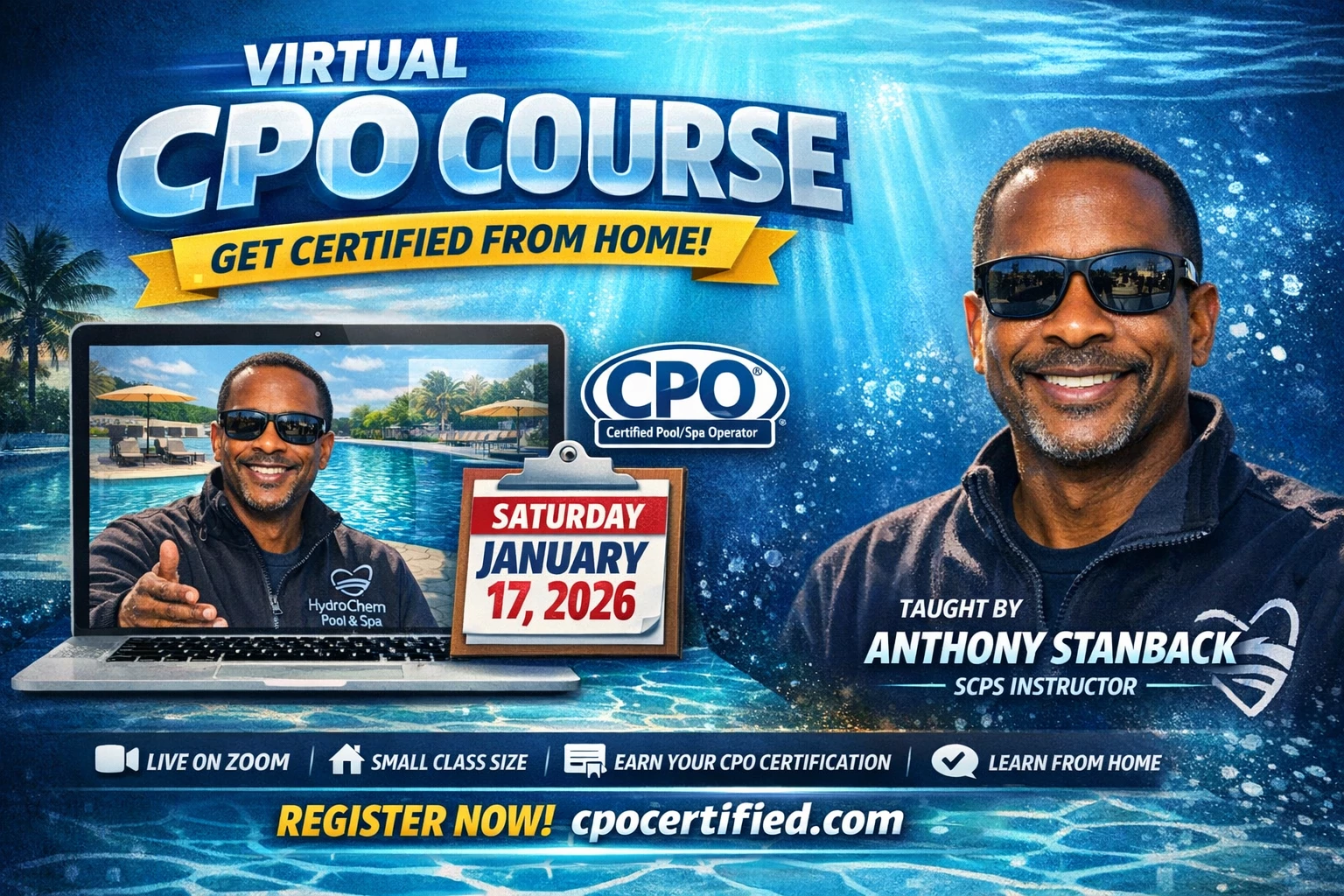 Space Coast Pool School is hosting a live virtual CPO course on Saturday, January 17, 2026, taught by industry professional Anthony Stanback, a valued member of our expert SCPS instructor team.