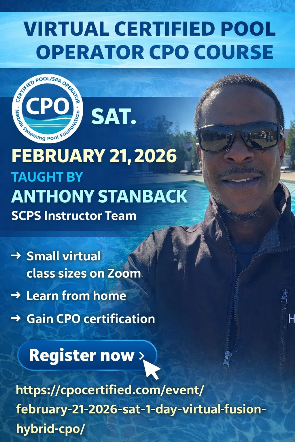 Join us for our Virtual Certified Pool Operator (CPO) Course on Saturday, February 21, 2026, taught by Anthony Stanback, part of the industry-experienced SCPS Instructor Team.