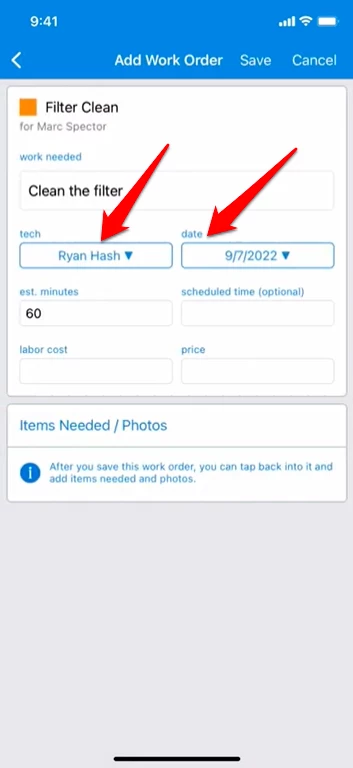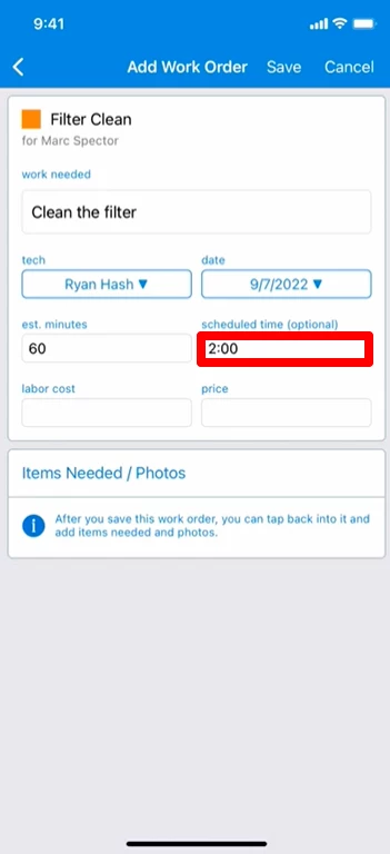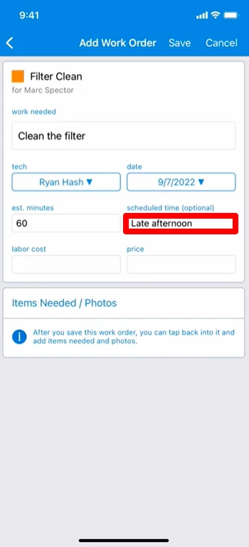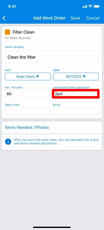 - Now the work order is there, on the customer profile. But what if you just got word that the original time won’t work for your customer? Simply tap on the work order and edit the time, then tap the back button.