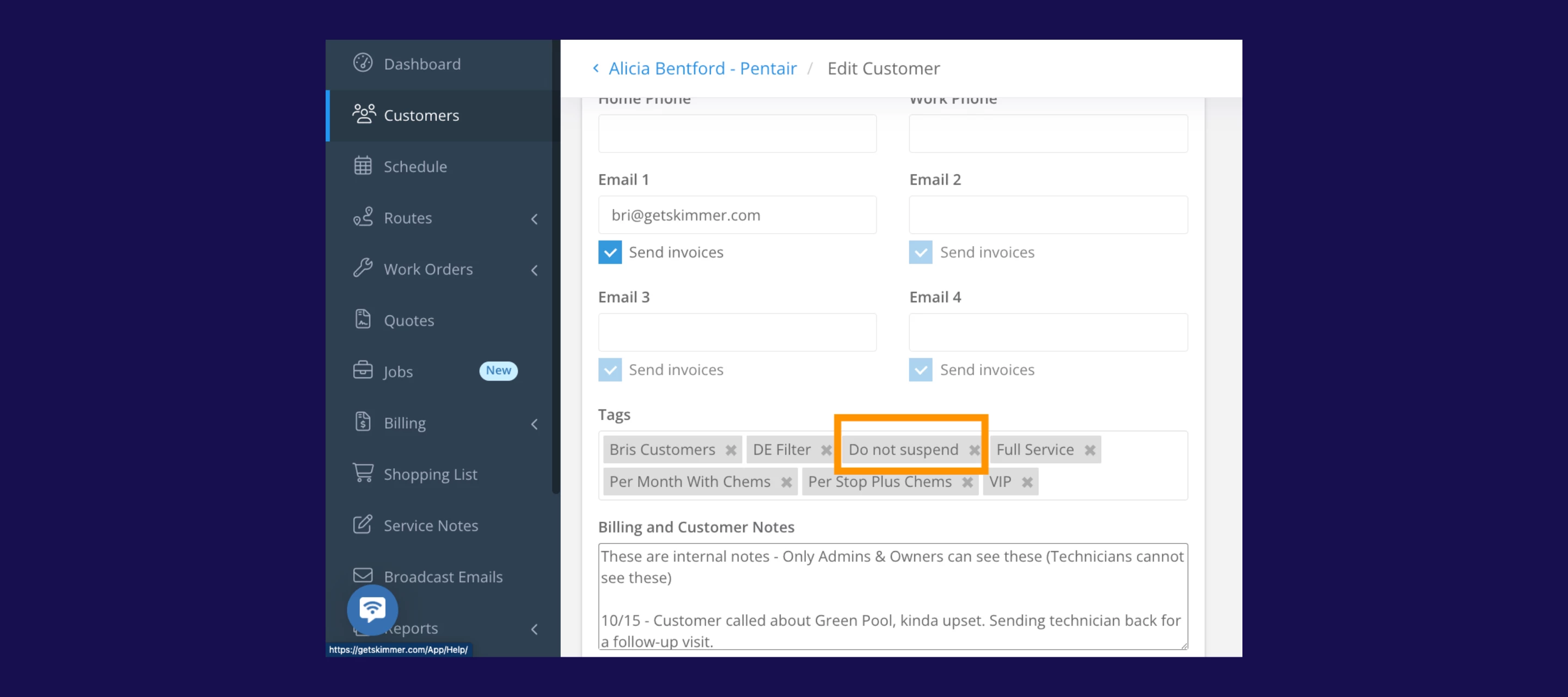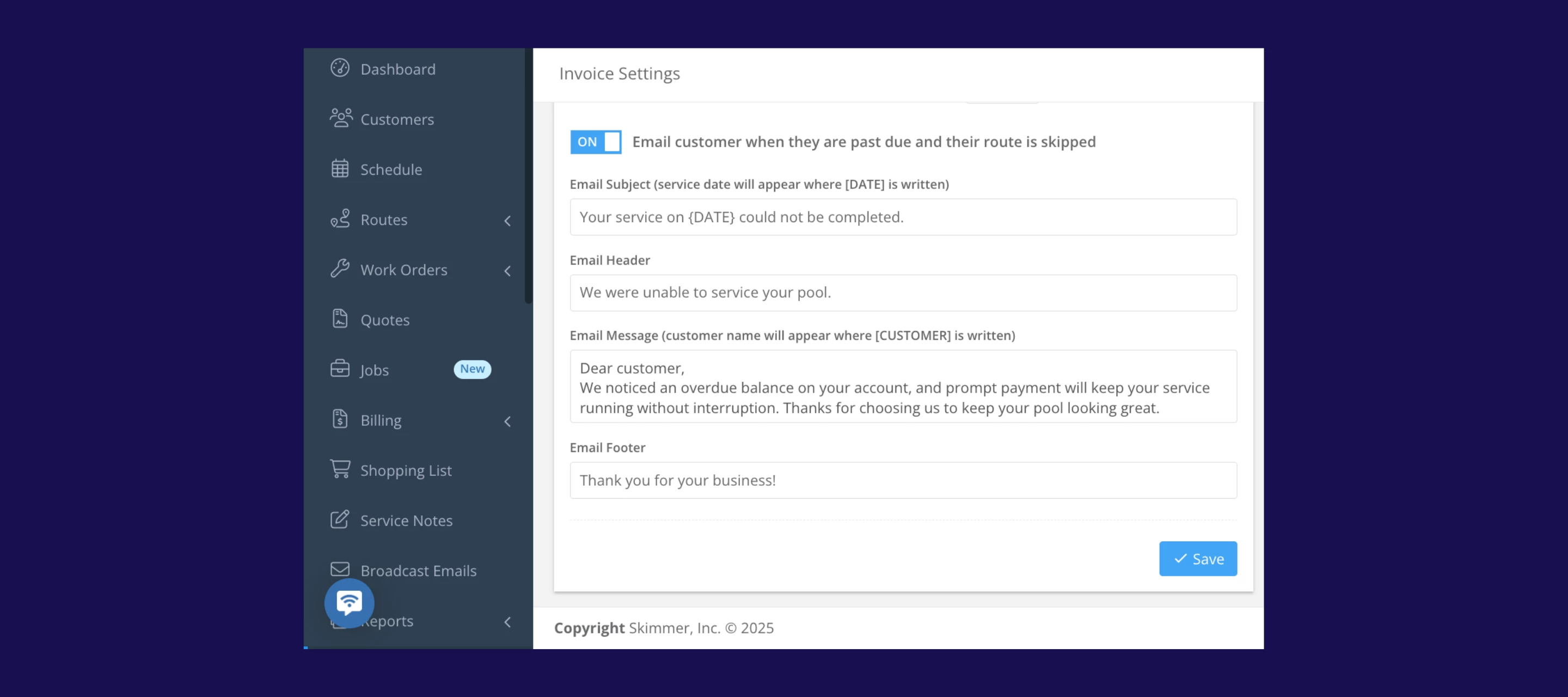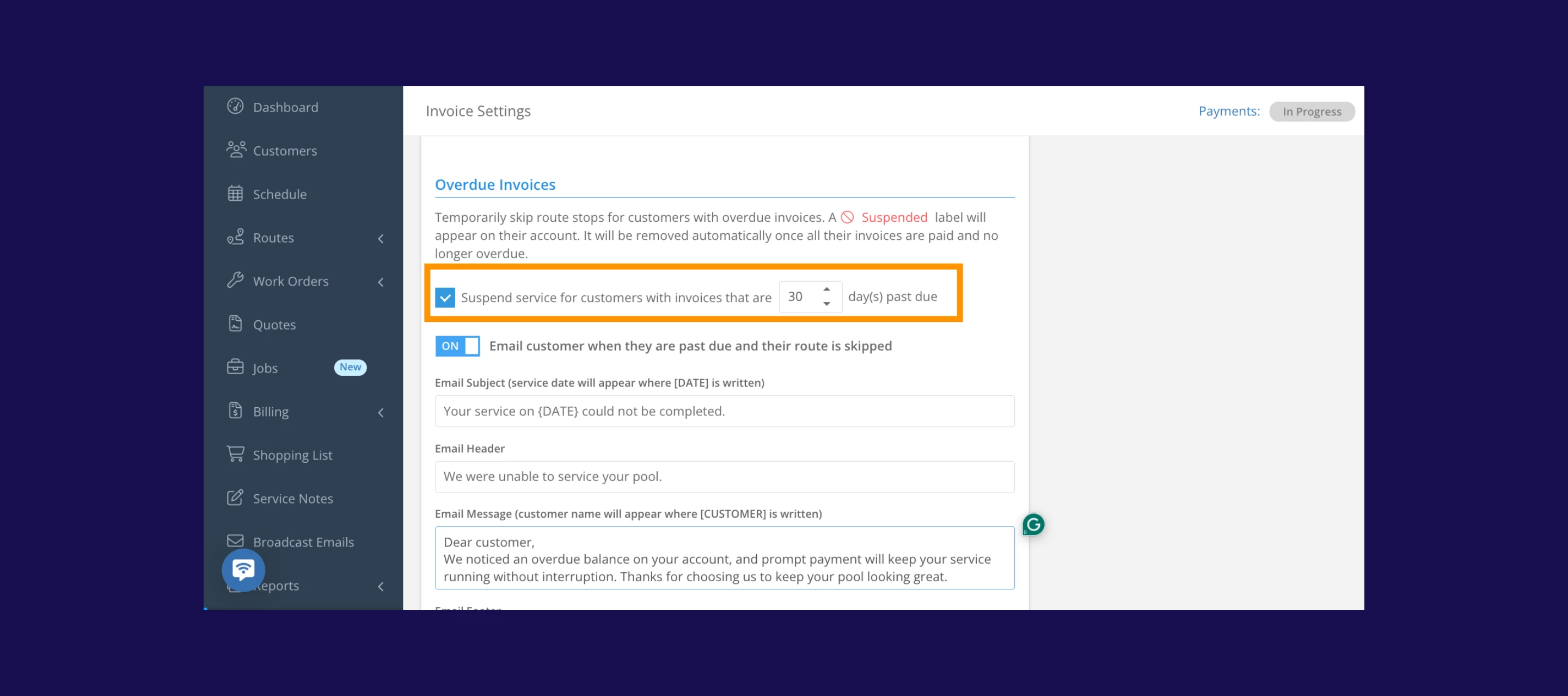 - Automatic suspensions based on overdue invoices: Admins can set the number of days before service is suspended (default is 30; adjustable 1–99days) to match your billing policy. Once a customer hits that threshold, Skimmer automatically flags them as suspended and stops adding them to daily routes.