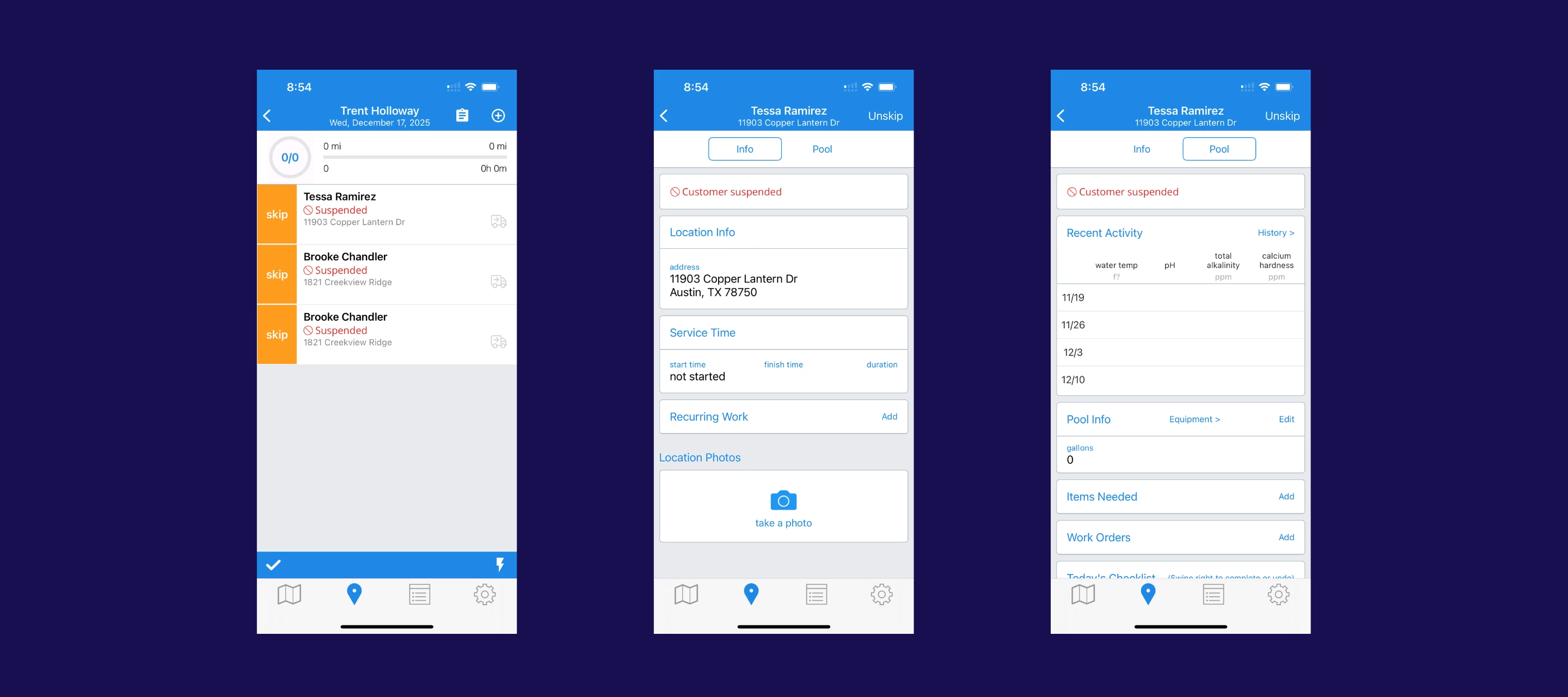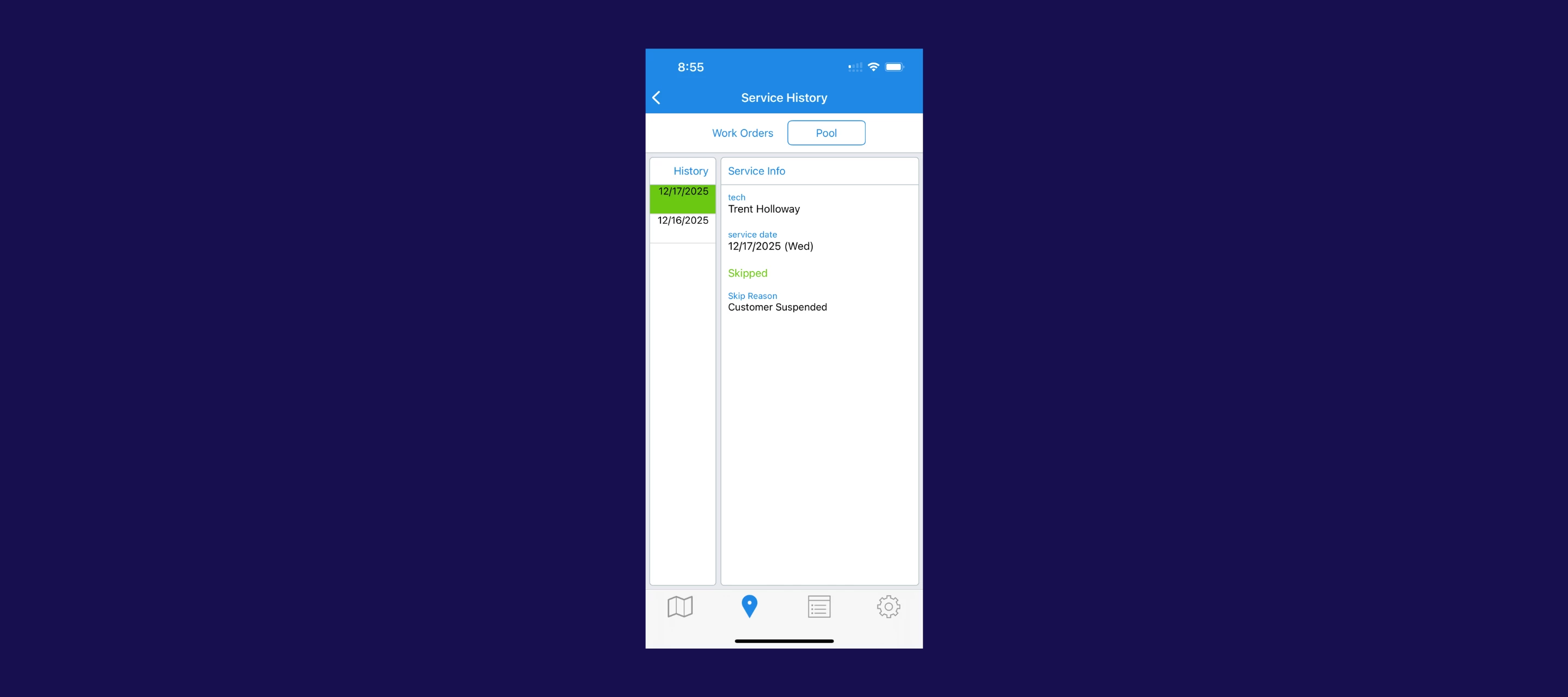 - Route impact for technicians in the field: Suspended stops are automatically skipped, and techs will see a clear “Suspended” tag in the mobile app. The stop also stays visible in service history as Skipped — Customer Suspended for full documentation.