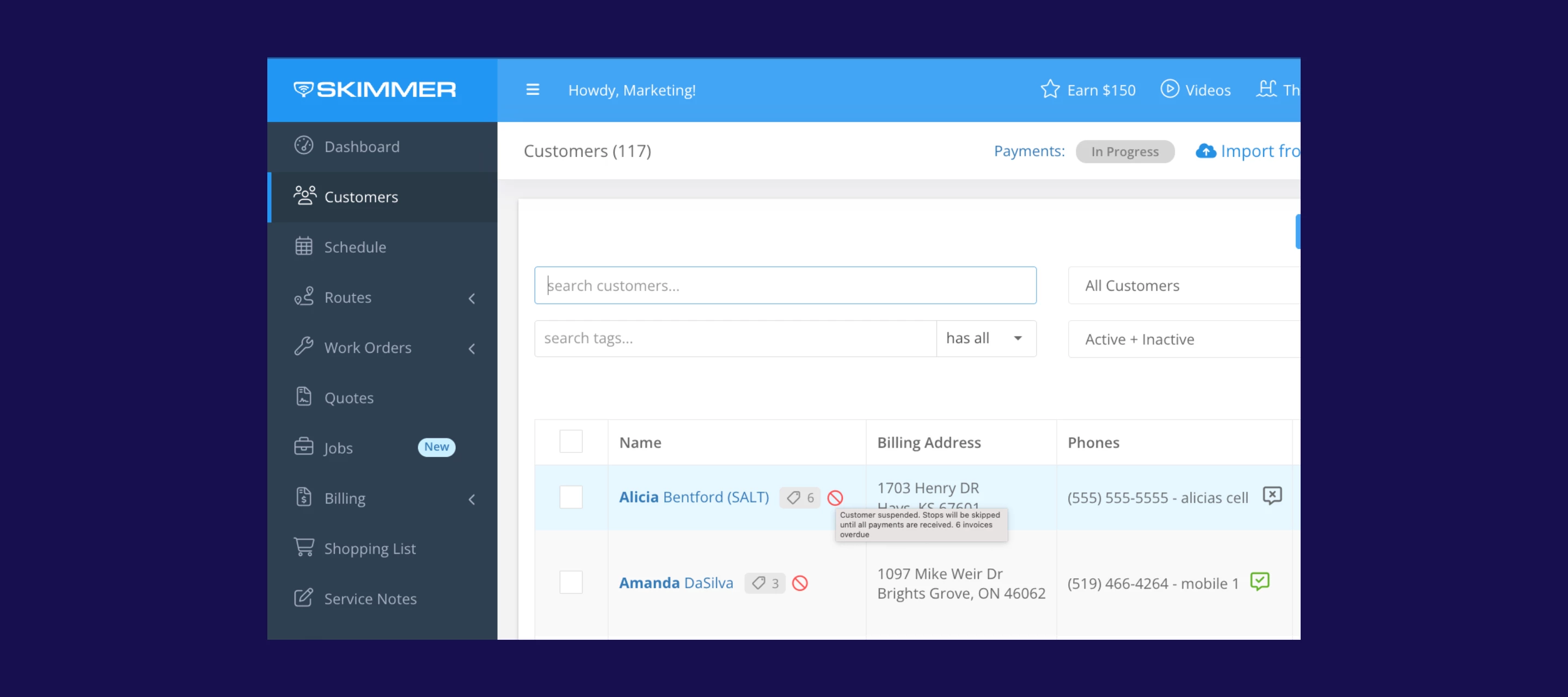 - Updated customer dashboard: Anywhere you view customers within Skimmer, you’ll now see a clear Suspended🚫 label instead of “Past Due.” We’ve also added a new filter so admins can instantly see all suspended accounts—making collections follow-up a whole lot easier.