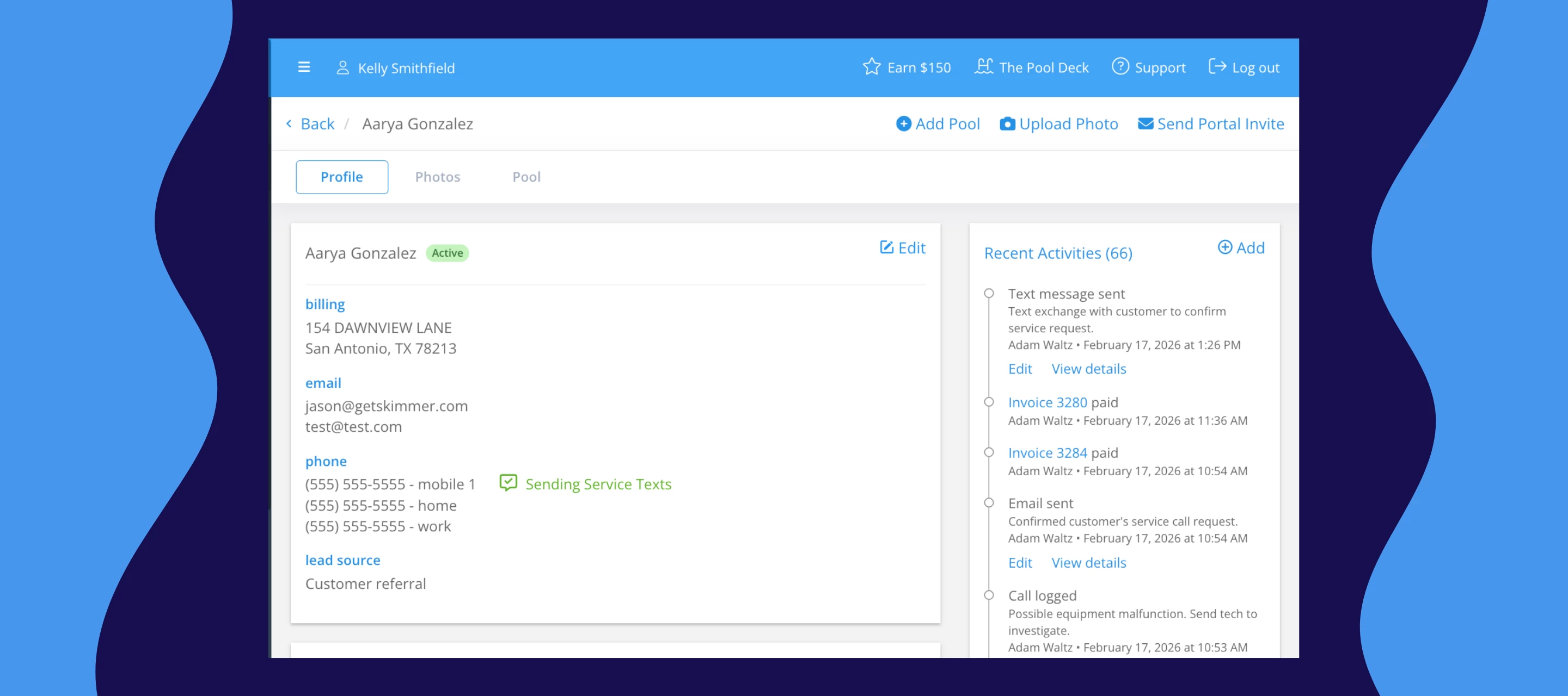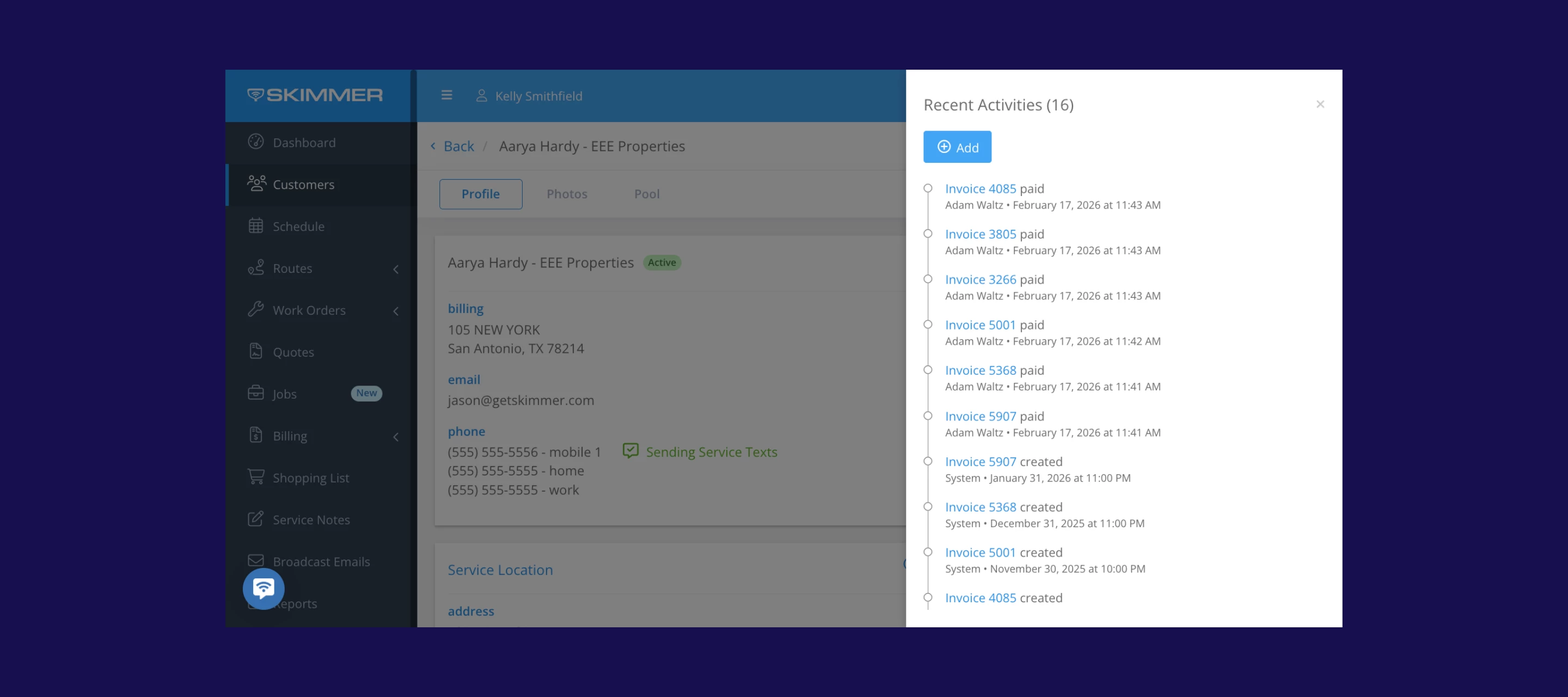 Each customer's detail page now includes an activity feed — a centralized timeline of every interaction in Skimmer. Quotes, invoices, payments, and customer portal invites all show up in one place, in chronological order. And this is just the beginning — we'll be adding more activity types to the feed as we continue rolling out new capabilities.