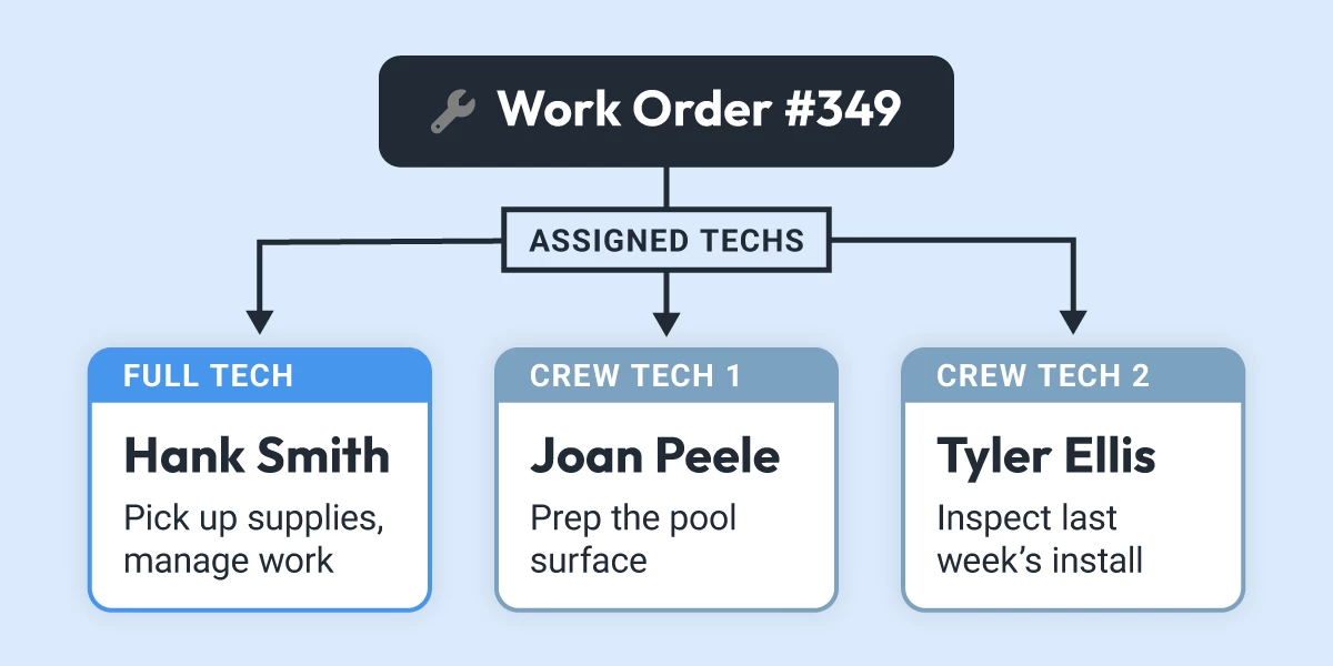 Assign a full tech and up to 8 crew techs to any work order. Each person gets their own instructions and time allocation. The full tech oversees the finishing of the job and handles readings, chemicals, and parts. Crew techs can add their own work notes without accidentally finishing the job or modifying critical details.
