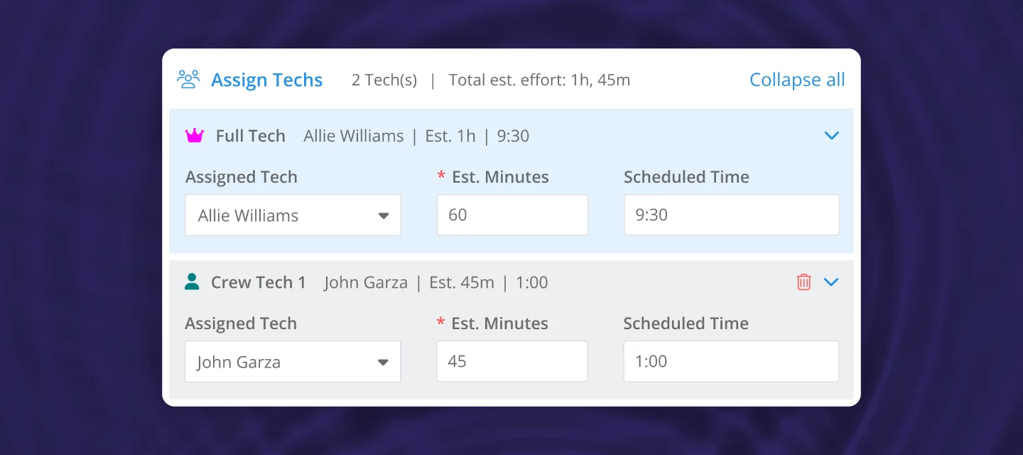 Schedule once. Need to move the job? Shift the whole crew in seconds. Need to swap a tech? Change one assignment without reworking everything. Less admin, fewer headaches.