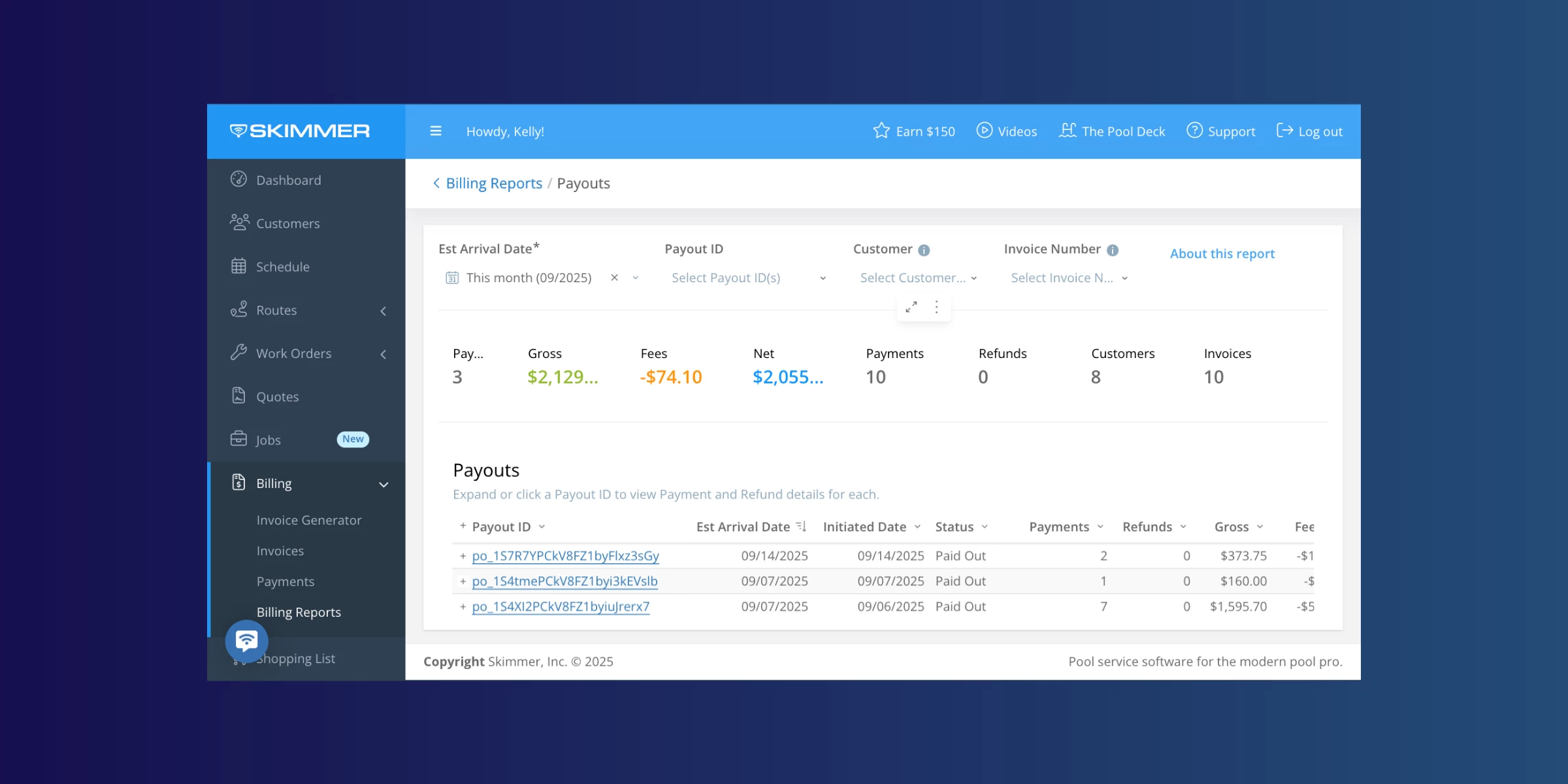 This month’s release includes quote deposits, a brand-new payouts report, automatic customer notifications for scheduled work orders, and the latest Skimmer mobile app 12.7 update. Here’s your full September roundup:
