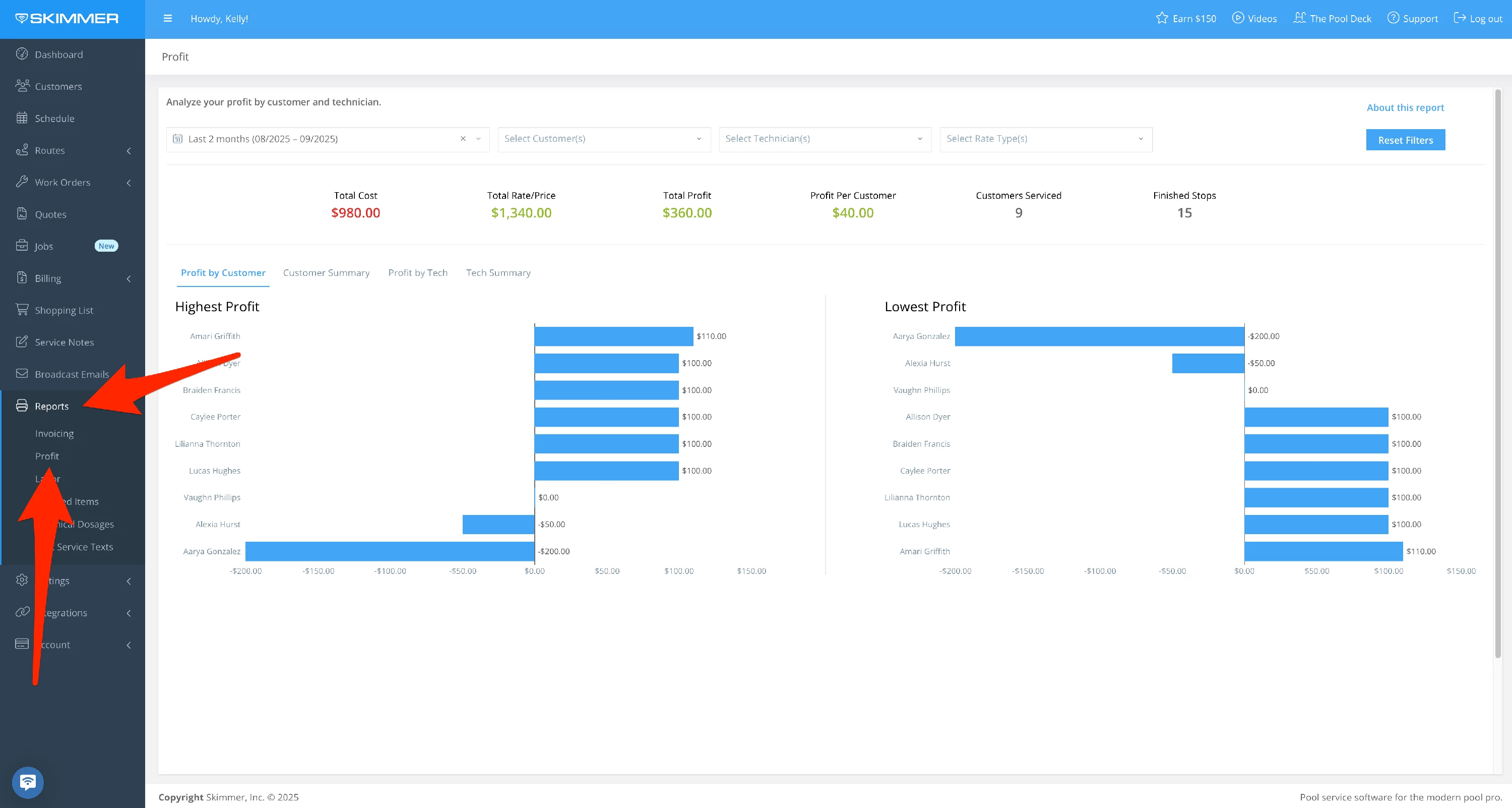 Note: The Profit Report displays and breaks down profits per customer serviced during a select date range. Access the report by going to Reports > Profit.