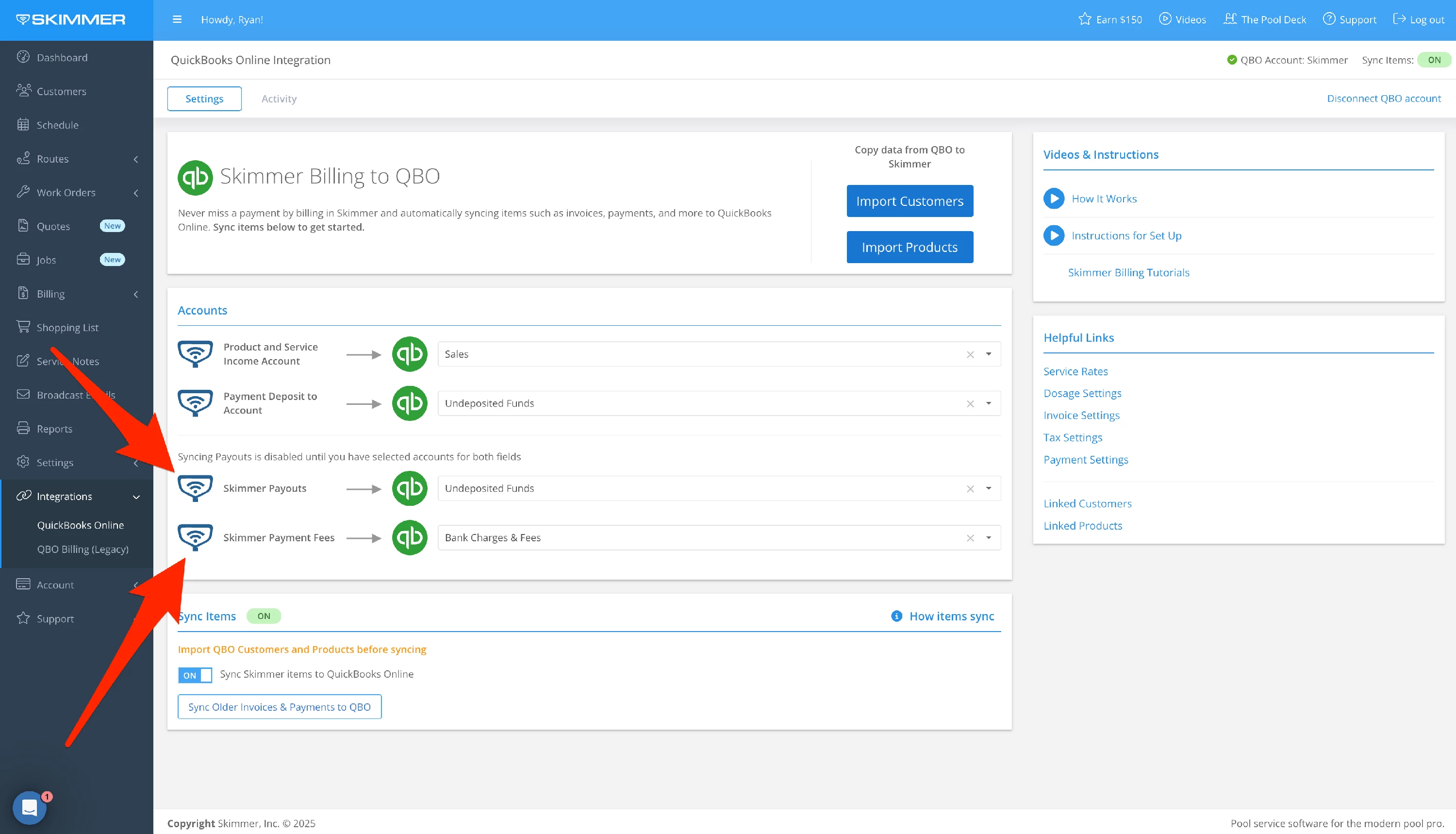1. Skimmer lets you sync billing, customer, and product data to QuickBooks Online automatically. To set up your connection to QBO, go to Integrations → QuickBooks Online → Connect to QBO.