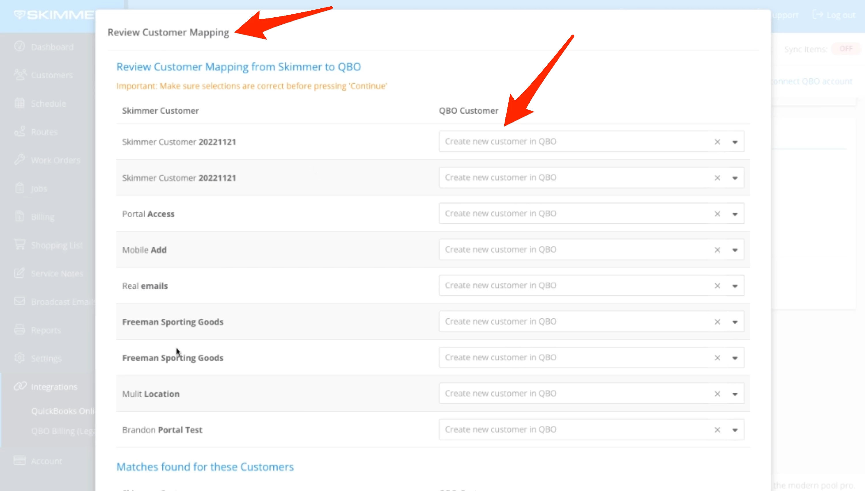 9. Once you activate the sync, you’ll automatically get this pop-up screen. Review all the customers that this integration will map from Skimmer to QBO. At the top, you’ll see customers in Skimmer that the system wasn’t able to find direct matches for. To map them to accounts in QBO, use the dropdown lists. If you leave the dropdown blank, Skimmer will create a new customer in QBO.