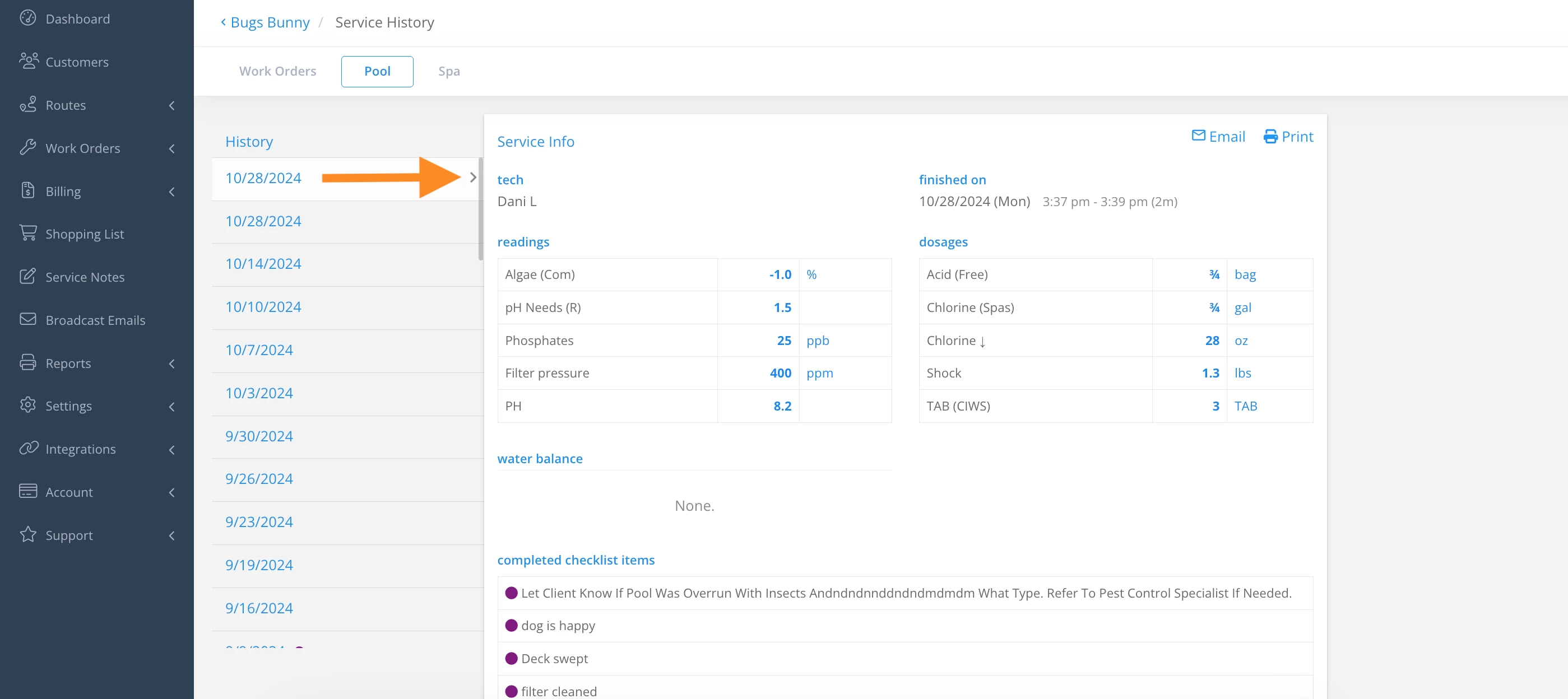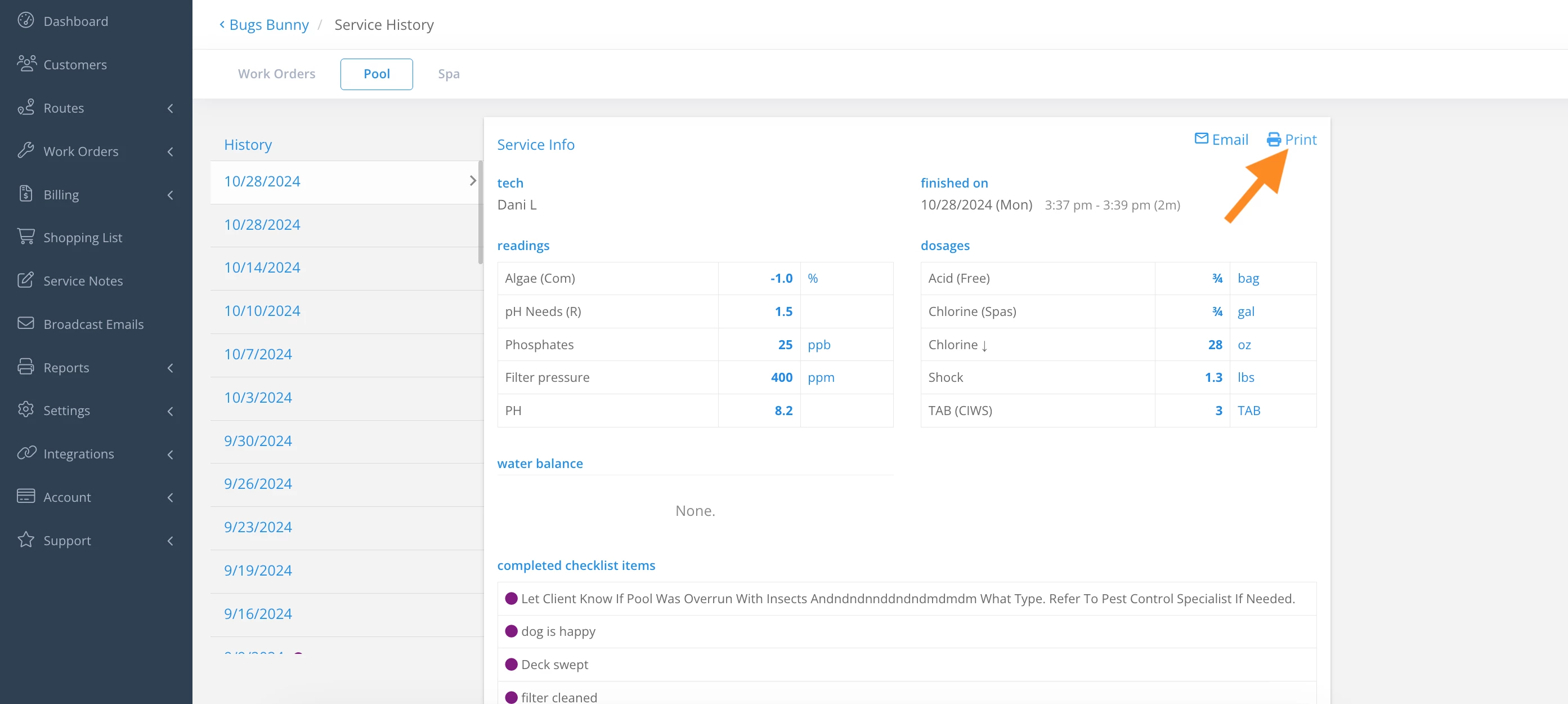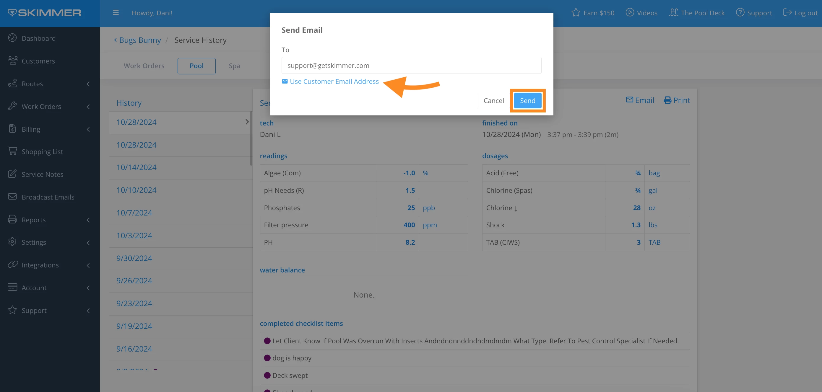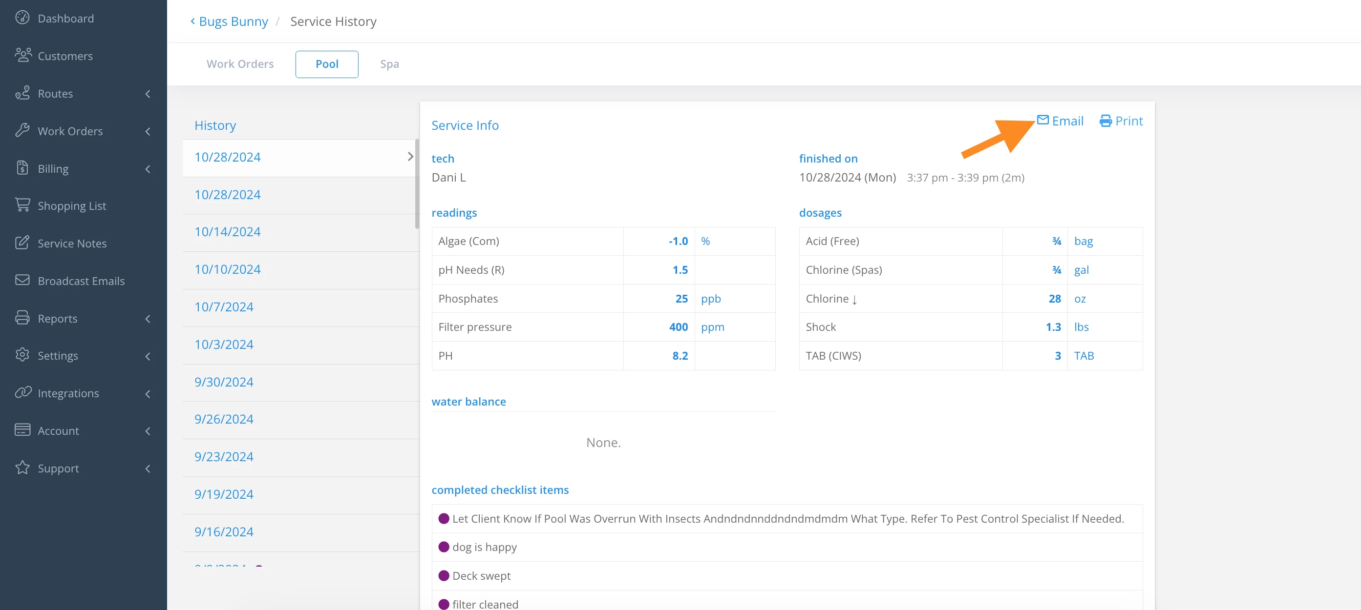 6. To resend a service email, click the Email icon > User Customer Email Address > Send.