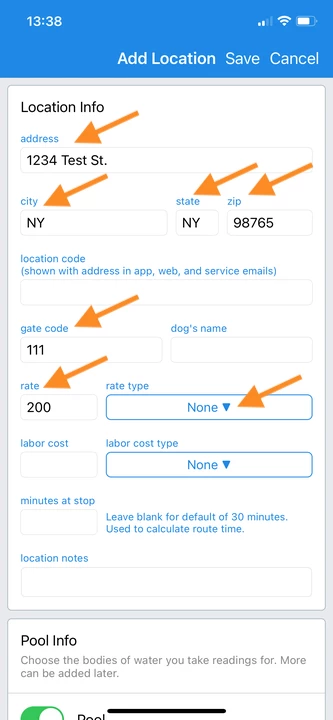 - Gate code, dog's name, minutes at stop, and location notes are optional.