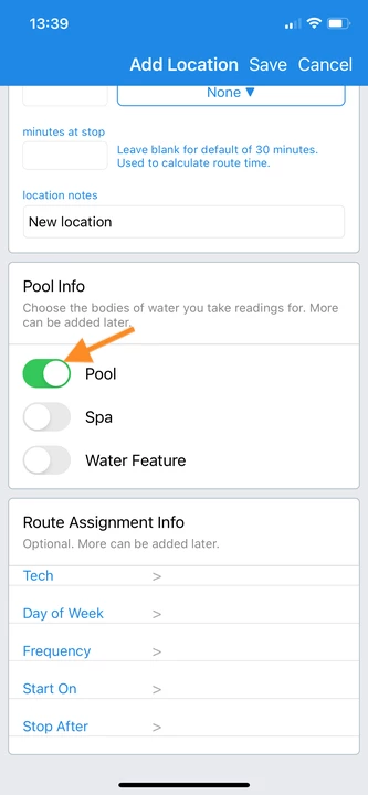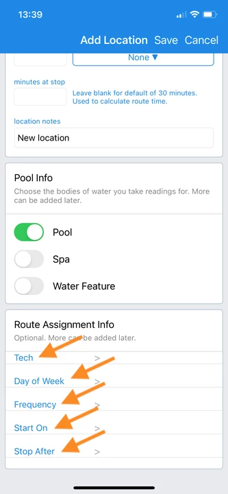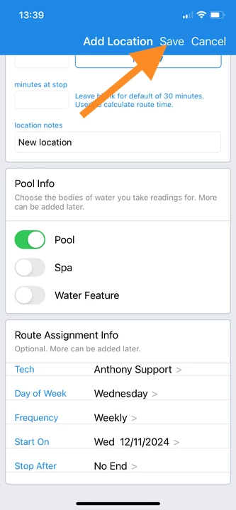 6. To create a Route Assignment, tap to select a Tech > Day of Week > Frequency > Start On > Stop After (optional).